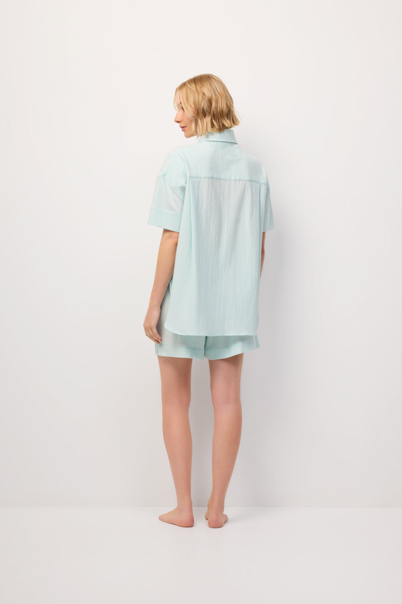 The short-sleeve oversized shirt is finished with honeydew mother-of-pearl buttons and our signature emblem on the cuff. The matching boxer shorts provide relaxed comfort and are completed with our signature waistband emblem for a polished final detail.