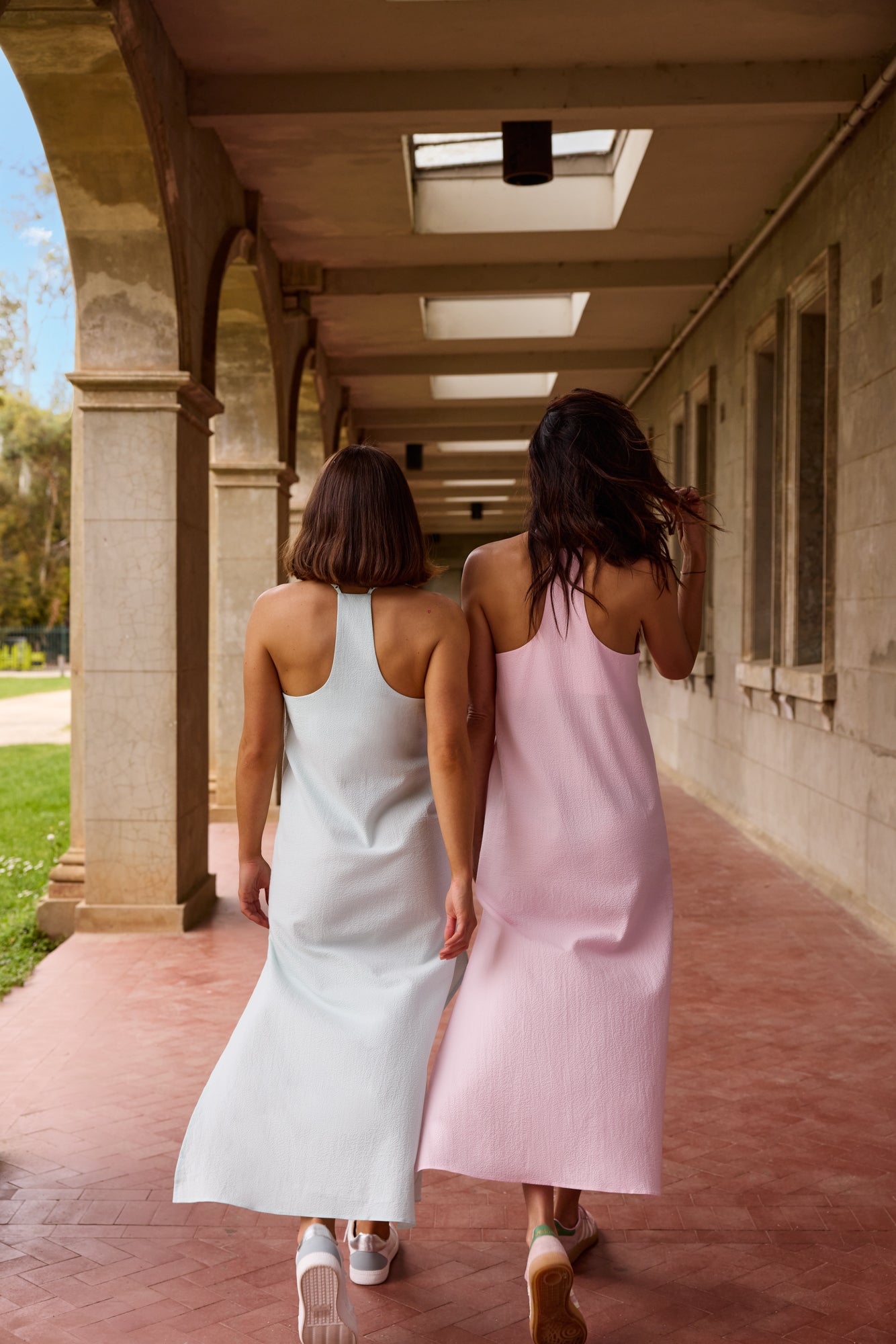 The Dolce Camisole Slip Dress Long is a beautifully refined piece crafted from a crisp seersucker in rosewater. With its effortless drape and lightly textured finish, it skims the body softly while remaining cool, breathable, and flattering.