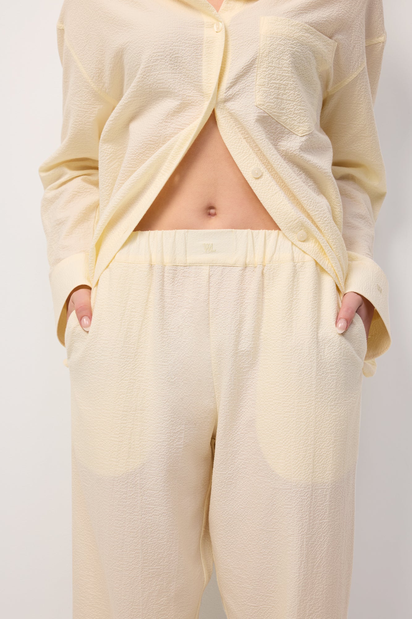 The oversized pyjama shirt is detailed with butter yellow-toned mother-of-pearl buttons and finished with our signature emblem embroidered on the cuff. It pairs with the limoncello Long Pants, designed with a relaxed silhouette and completed with our signature waistband emblem for a polished, considered finish.